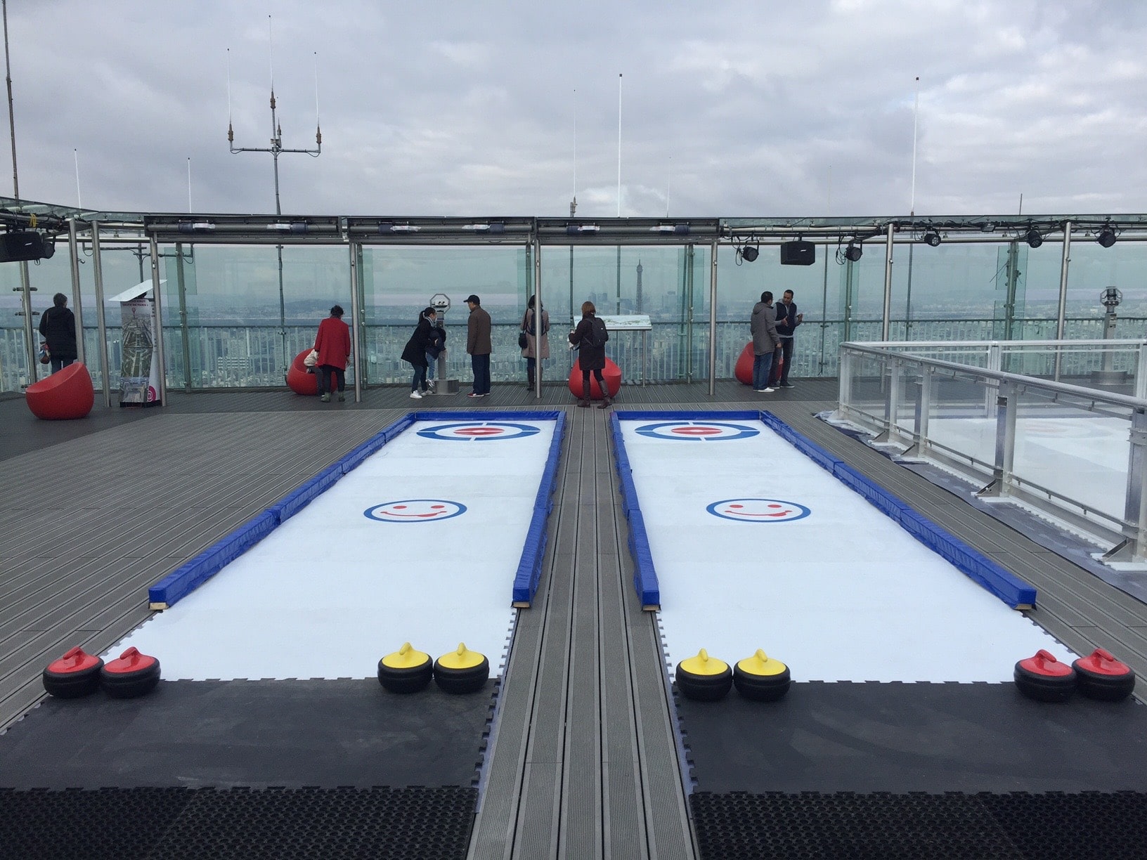 C’est en quelque sorte un jeu de boules sur glace….mais les boules sont des “pierres” et la glace est de la glace synthétique de grande qualité.